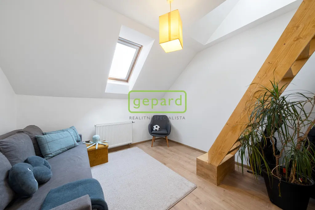 Už při vstupu vás překvapí příjemná vzdušnost a množství světla. Hlavní obytné podlaží působí otevřeně a přirozeně propojuje obývací prostor s kuchyní, odkud se vychází na balkon. Je to místo pro každodenní život a setkávání. Nechybí ložnice s vestavěnou skříní a koupelna s vanou. Horní patro nabízí další úroveň soukromí – samostatné pokoje, pracovnu i oddělenou koupelnu a toaletu. Velkým benefitem je terasa s otevřeným výhledem do okolní krajiny, která má své kouzlo v každém ročním období. Jeden z pokojů je navíc rozšířen o praktické spací patro, které přidává další využitelné metry – ať už pro spaní, relax nebo kreativní prostor.