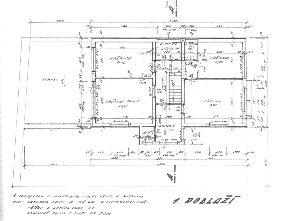 Rodinný dům o dvou nadzemních podlažích (+ sklep) z roku 1980 nabízí dostatek prostoru pro velkou rodinu nebo pro fungování dvou samostatných bytových jednotek. K hornímu bytu (4+1) náleží velká terasa nad garáží s orientací na jiho-západ, která nahrazuje posezení na zahradě a v létě zafunguje jako druhý obývací pokoj. Stejné zázemí poskytne dolnímu bytu (3+kk) dvorek, který se ještě zvětší po případném zbourání dřevěné stodoly.