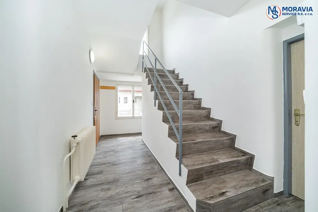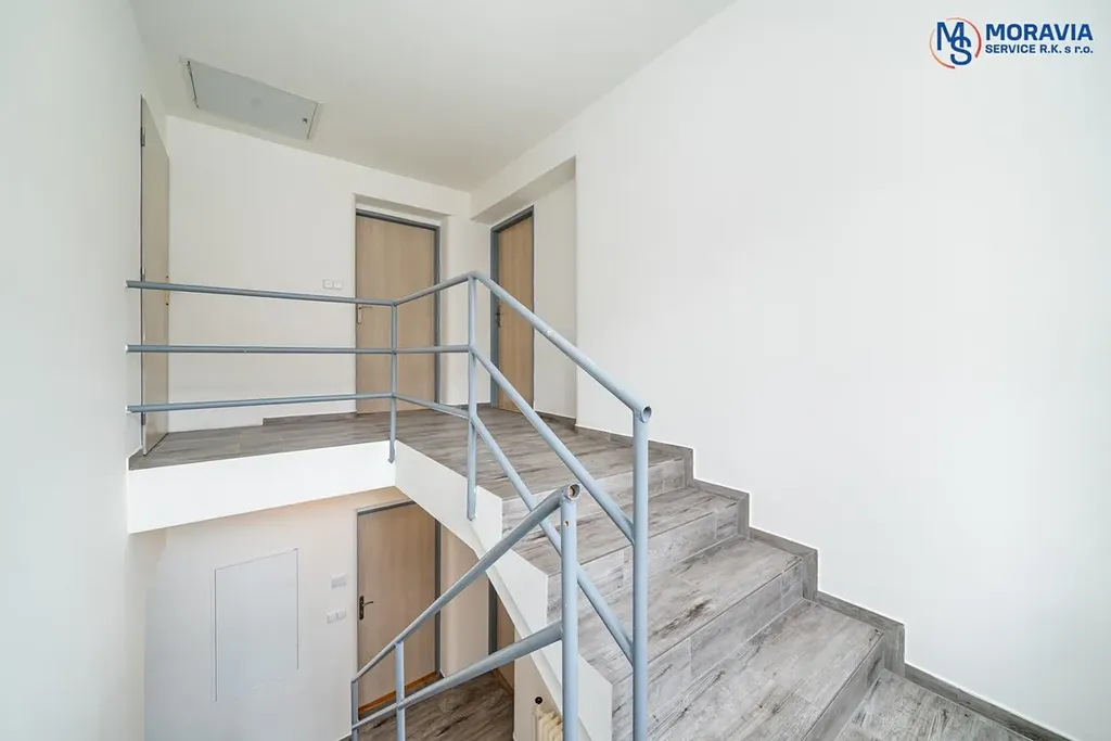 První patro nabízí dva samostatné pokoje, z nichž každý má vlastní kuchyňský kout. Tato dispozice je perfektní pro vícegenerační bydlení nebo pro rozdělení kancelářských prostor mezi různé týmy. Společná koupelna na patře je praktická pro všechny obyvatele či zaměstnance.