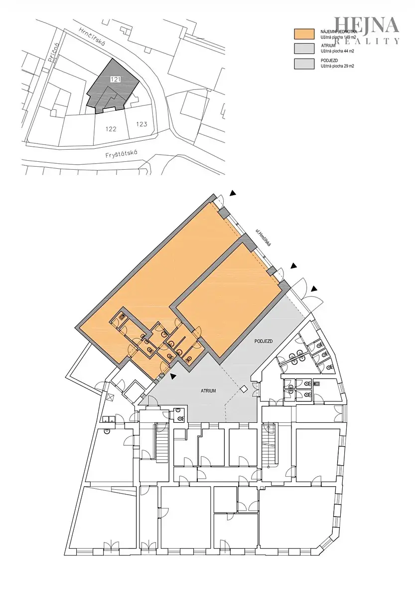 K prostoru náleží také dvůr (atrium) a možnost vjezdu přes vrata, což je velkou výhodou například pro zásobování, parkování nebo kombinaci provozu se skladem.