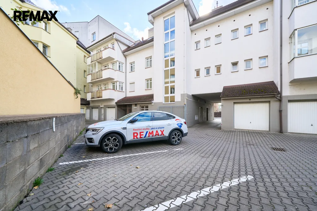 Velkým benefitem je možnost parkování na společném pozemku přímo ve vnitrobloku. Celý prostor je uzavřen vjezdovou bránou, což zajišťuje bezpečné a pohodlné parkování přímo u domu.
