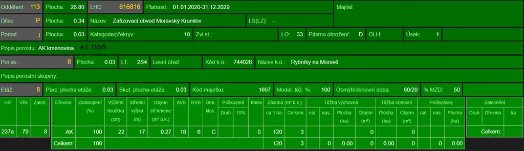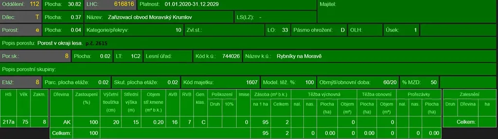 - p.č. 635/8 vedená jako lesní pozemek o celkové výměře 1 742 m2 (stáří 80 lesa let - zastoupení dřevin akát),