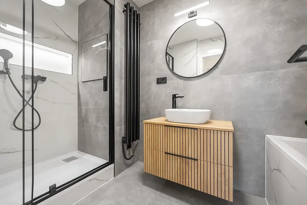 Koupelna je s vanou, sprchovým koutem, elegantním topným žebříkem, podlahovým topením a designovým umyvadlem na praktické skříňce se dvěma zásuvkami. V bytě je samostatná toaleta s vlastním umyvadlem a bidetovou sprchou. Pračka je připravena v samostatné technické místnosti.