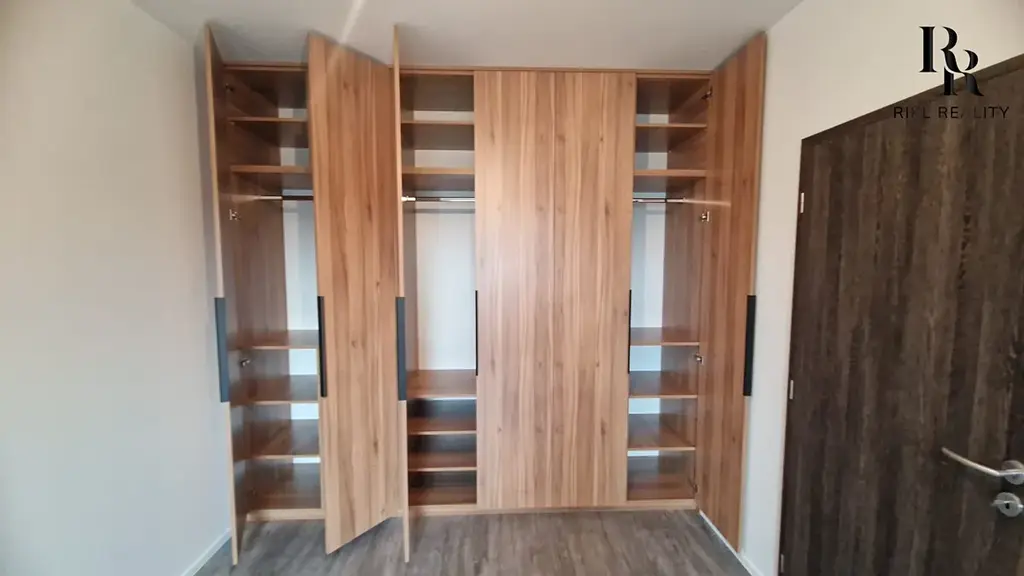 Interiér bytu je navržen v moderním stylu s důrazem na komfort bydlení. Velkým benefitem je podlahové vytápění, které zajišťuje příjemné teplo v celém bytě, a také klimatizace, díky které si udržíte ideální teplotu i v letních měsících. Součástí bytu je také praktická komora, která poskytuje dostatek úložného prostoru.