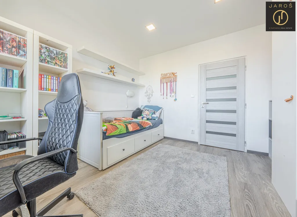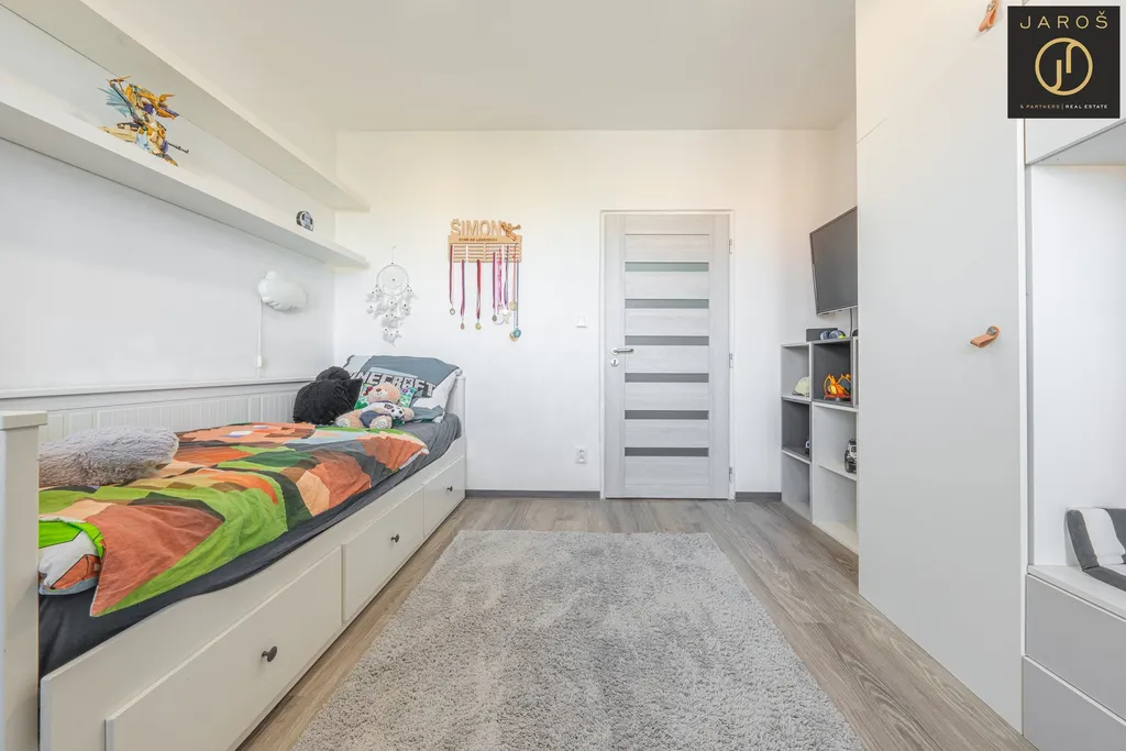 Dispozice je praktická a dobře využitelná – vstupní zádveří, dětský pokoj, obývací pokoj s kuchyňským koutem, průchozí koupelna se sprchovým koutem a za ní situovaná ložnice, WC je samostatné.