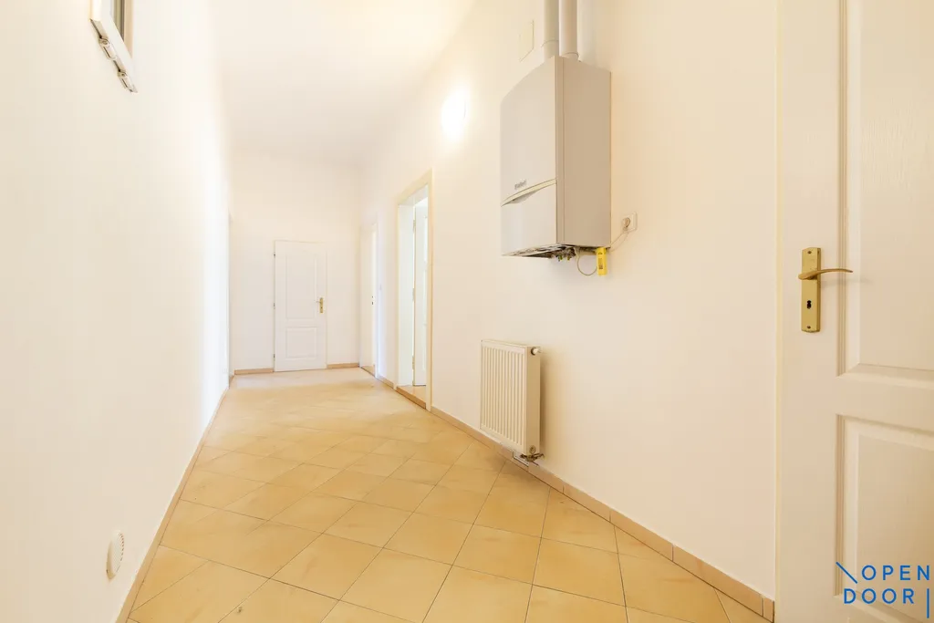 Byt je dobře dispozičně členěn - dva pokoje směřují do ulice, třetí pokoj s malým balkonem na jihozápadní stranu do vnitrobloku. Dva pokoje jsou neprůchozí, z obývacího pokoje se vstupuje do kuchyně, vybavené kuchyňskou linkou se spotřebiči. Byt má dvě koupelny, větší je s vanou, má přípojku pro pračku, druhá koupelna je se sprchovým koutem, umyvadlem a s WC. Byt má prostornou vstupní halu, k bytu náleží i sklepní koje. Topení a ohřev vody zajišťuje kondenzační plynový kotel. Na podlahách obytných místností jsou parkety, v ostatních prostorách dlažba. Dům má výtah.