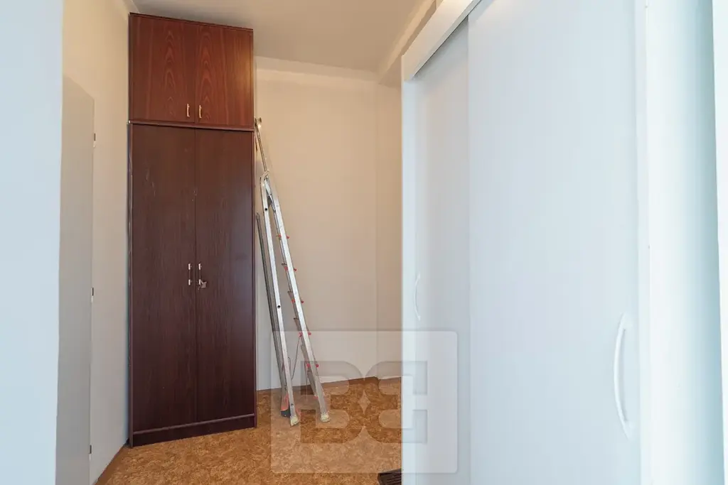 Byt se nabízí jako nevybavený, jeho součástí je však kuchyňský kout se spotřebiči a skříň v předsíni. Na podlahách je položeno lino. Okna jsou plastová.