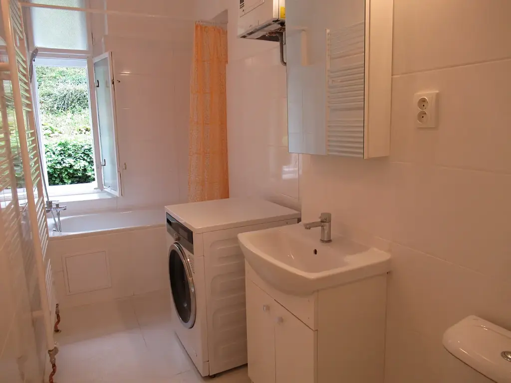 Byt je vybavený kuchyňskou linkou s vestavnou troubou, sklokeramickou deskou a myčkou, v koupelně je vana, WC a pračka. Podlahové krytiny- renovované parkety a dlažby, topení a ohřev vody zajištěny kondenzačním plynovým kotlem. Z prostorné chodby jsou vstupy do koupelny, kuchyně, jednoho pokoje a obývacího pokoje, ze kterého se vchází do pokoje třetího. K dispozici je také menší zahrada o rozloze 30 m², která poskytuje možnost odpočinku a relaxace na čerstvém vzduchu.
