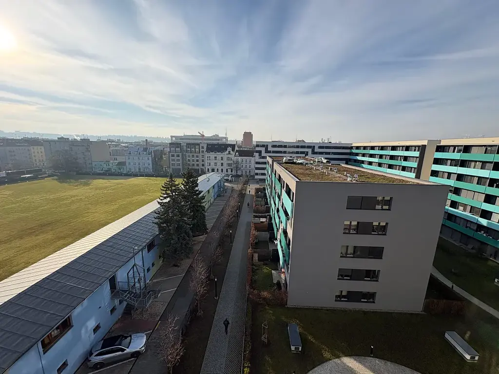 Byt se nachází v sedmém patře s výhledem, který dodává prostoru otevřený a světlý charakter.