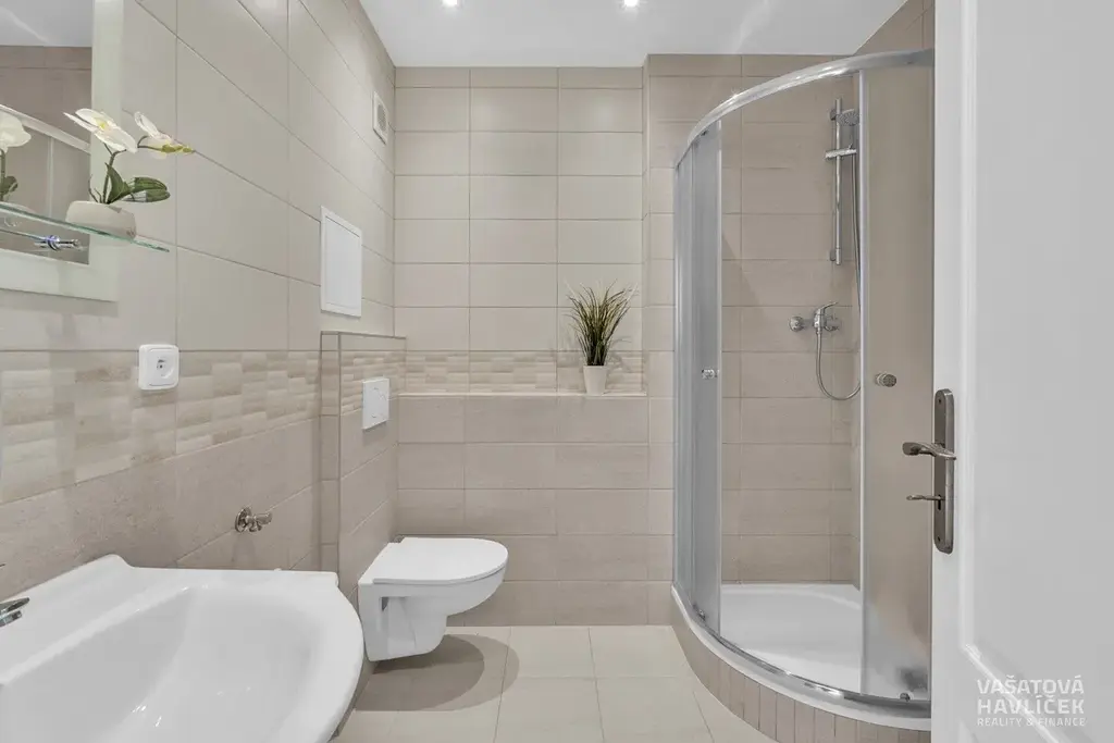 > sprchový kout, umyvadlová skříňka s umyvadlem a zrcadlo