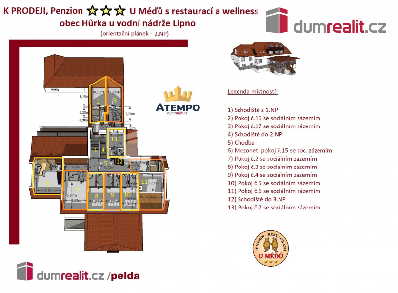 Fungující penzion je částečně podsklepený a je vystaven do 2 nadzemních podlaží s obytným podkrovím. Podrobné rozkreslení dispozice naleznete na orientačním plánku mezi fotografiemi. Z většiny pokojů je výhled na vodní nádrž Lipno.