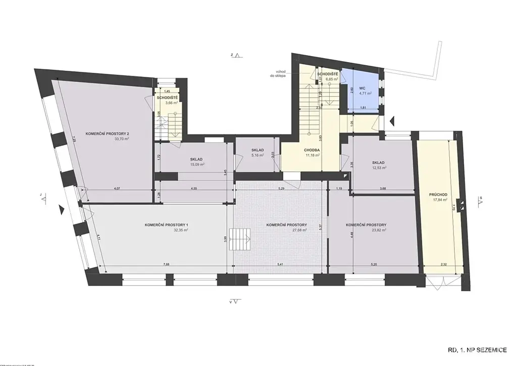 V 1NP je rozdělené na dva nebytové prostory, skladové prostory, chodbu a 2x WC.