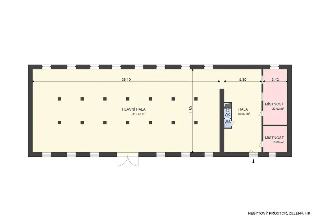 > skladové prostory (hlavní prostor cca 312 m²), 2 oddělené kanceláře, malá kuchyňka a samostatné WC