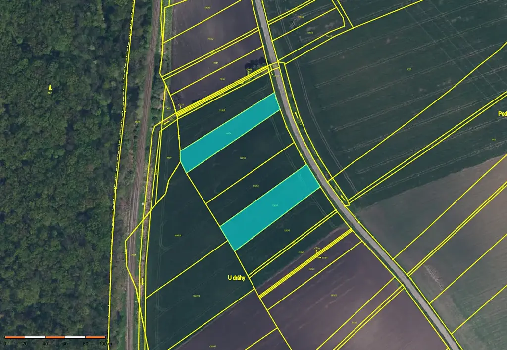 Prodávané parcely číslo 533/2, 533/17, 533/25, 534, 704, 858 v katastrálním území Ledce vedené na listu vlastnictví číslo 44 mají společnou výměru 158.003 m2.