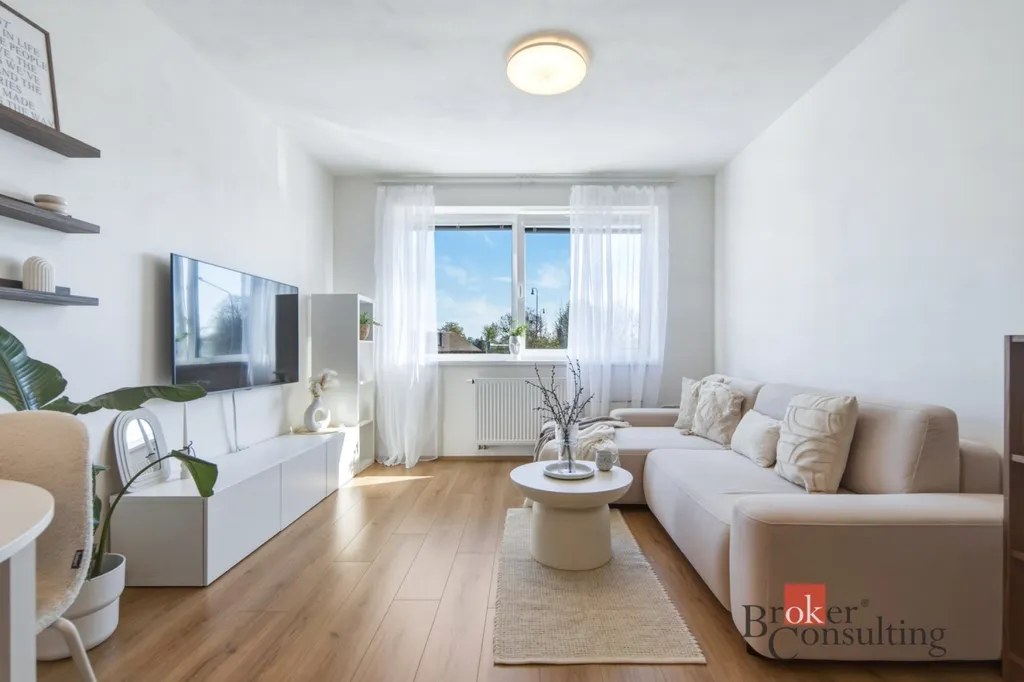 Na první pohled zaujme světlý a vzdušný interiér, který je laděný do jemných, nadčasových tónů. Obývací část s kuchyňským koutem tvoří příjemné centrum celého bytu, kuchyňská linka je kompletně vybavena vestavěnými spotřebiči (myčka, lednice, indukční varná deska a trouba), takže nabízí maximální komfort pro každodenní život i okamžité nastěhování. Díky orientaci oken na východ je byt krásně prosvětlený ranním sluncem a působí velmi příjemnou atmosférou po celý den.