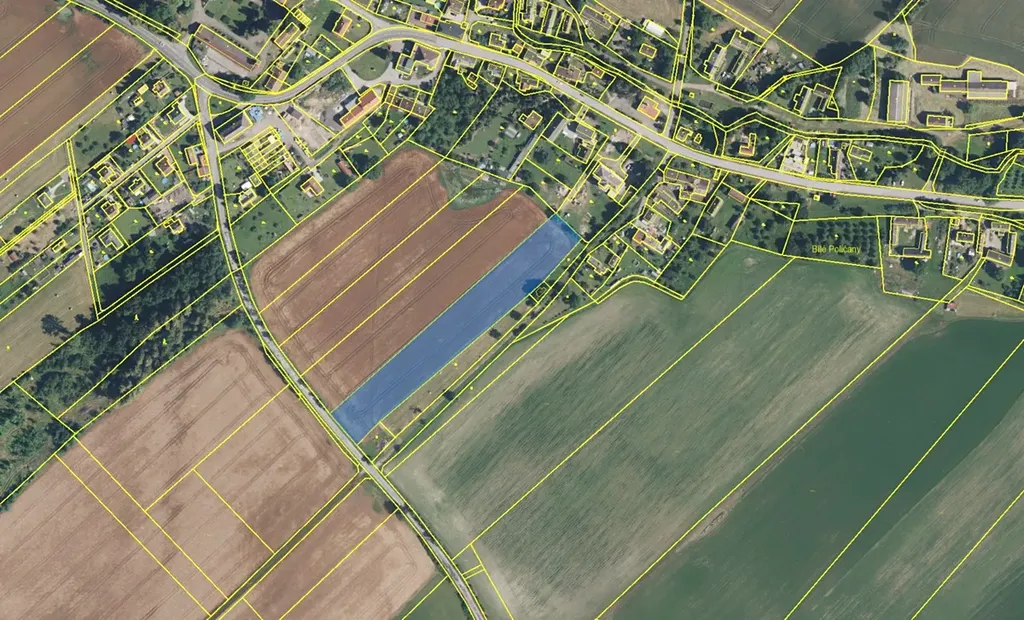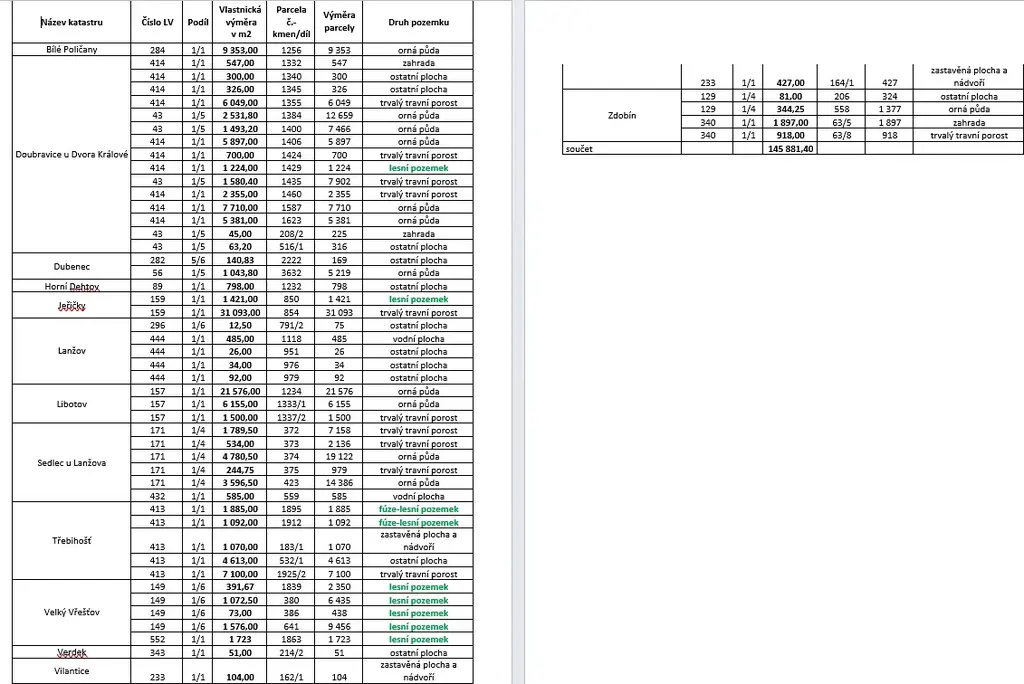 Přesná specifikace jednotlivých pozemků je uvedena v tabulce mezi přiloženými snímky.