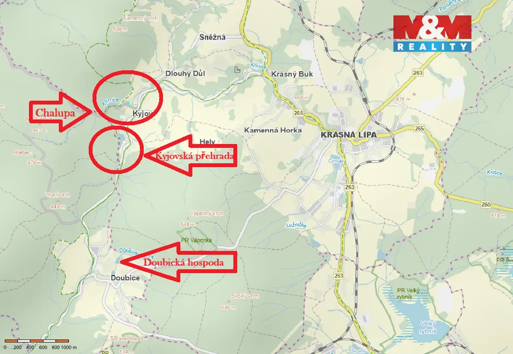 Hledáte klidné místo, pohodu a klid uprostřed krásné přírody, tak právě Vám nabízíme k prodeji chalupu v katastru Kyjova u Krásné Lípy v části obce Dlouhý Důl. Dispozice 4+KK je rozložena do IIINP. V INP obývací pokoj s krbovými kamny a kuchyňským koutem. Koupelna se sprchovým koutem a samostatné WC. Dřevěné schodiště do patra kde jsou 3 pokoje. Malý sklep se vstupem v chodbě pod schodištěm. Dominantou chalupy, která je na LV zapsaná jako stavba pro rodinnou rekreaci a má své č. ev. 72 je rozsáhlá zahrada o CP 1046 m². Objekt byl postaven v minulosti společně s majiteli sousední chalupy, ale každá nemovitost má svá popisná čísla a soukromí, díky uspořádání pozemků okolo nemovitosti. Na zahradě vlastní vrt s pitnou vodou. Ideální k rekreaci, případně výhodná investice k pronájmu pro milovníky klidu a přírody. V docházkové vzdálenosti možnost koupání v Kyjovské přehradě a ve 2km vzdálené Doubici vyhlášená Doubická hospůdka a další přírodní krásy v okolí. Budu se těšit s Vámi na prohlídce