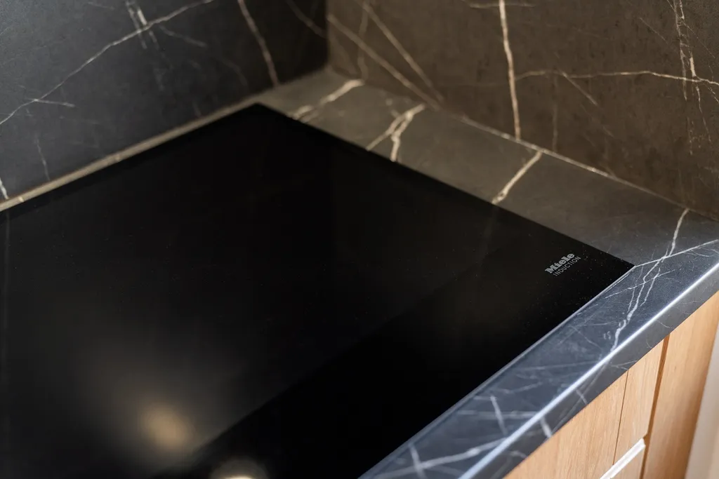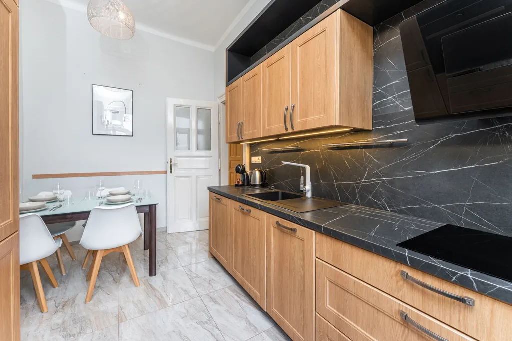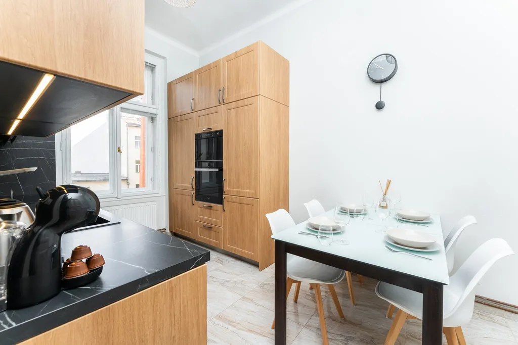 Bytová jednotka byla chytře optimalizována tak, aby nabídla dostatek úložného i spacího prostoru pro pohodlné každodenní bydlení. V rámci rekonstrukce byly zhotoveny nové podlahy a instalována kuchyňská linka na míru od renomované české společnosti Sykora. Kuchyň je vybavena spotřebiči převážně značky Whirlpool (myčka, lednice, mrazák, trouba) a varnou deskou Miele (indukce).