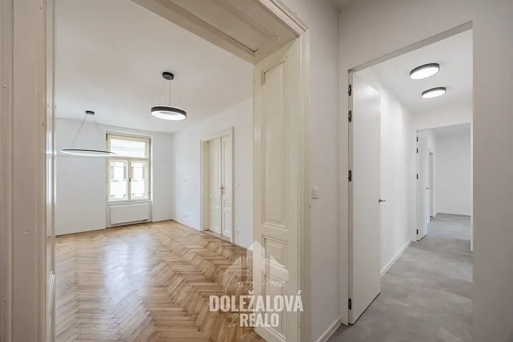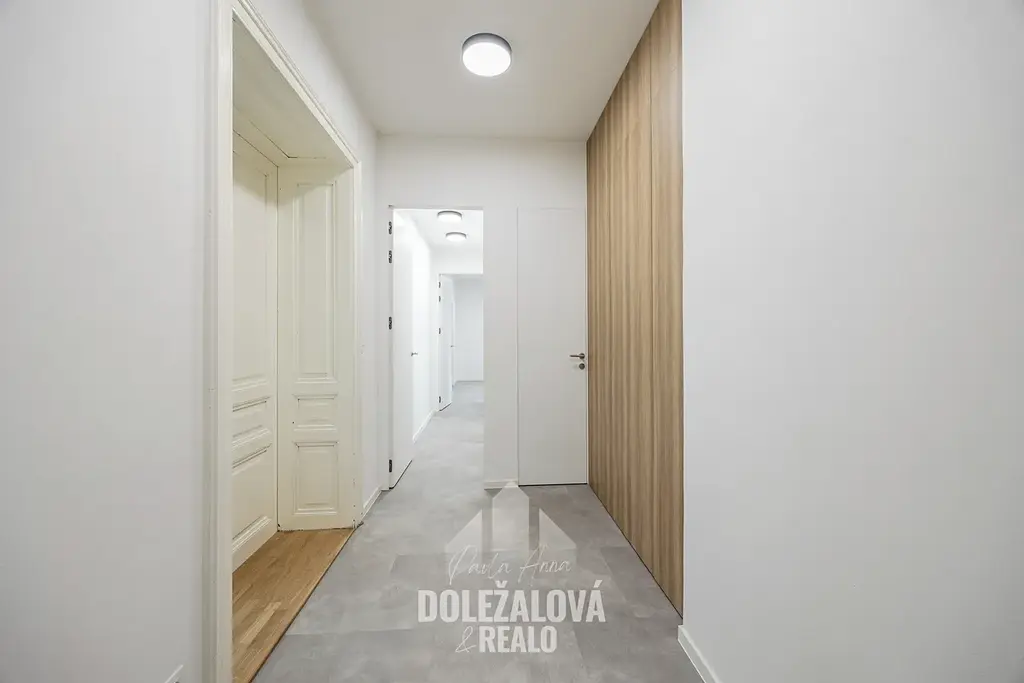 Dominantou bytu jsou renovované historické dvoukřídlové dveře, které prostoru dodávají jedinečný charakter, stejně jako krásné parkety, jež podtrhují eleganci celého interiéru. V kombinaci s moderním provedením vzniká harmonický celek, který působí nadčasově a reprezentativně.