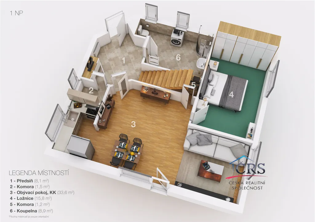 Dům disponuje užitnou plochou 105 m² a je prakticky řešen tak, aby splňoval požadavky moderního rodinného života. Dispozice domu je velmi praktická a nabízí dostatek prostoru pro celou rodinu. V přízemí se nachází vstupní chodba, koupelna s toaletou, technická místnost, prostorný obývací pokoj s kuchyňským koutem, ložnice a praktická komora umístěná pod schody. V patře jsou dvě samostatné ložnice, druhá koupelna s toaletou a v podkroví navíc menší úložný prostor vhodný například pro sezónní věci.