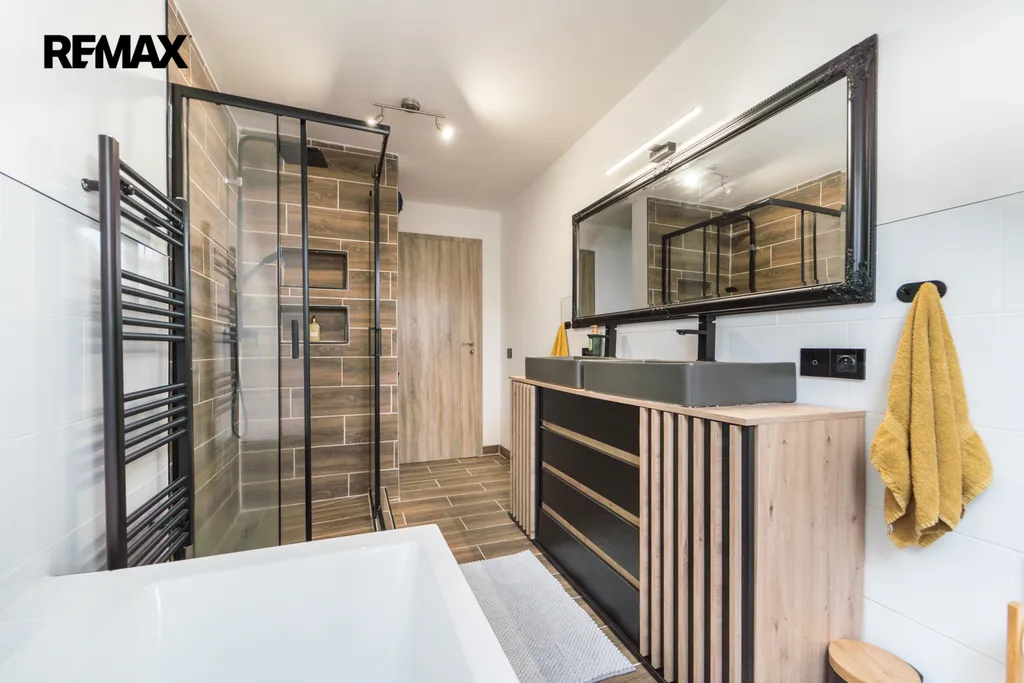 Dům nabízí podlahovou plochu přes 200 m². Dispozice je řešena velmi prakticky – v přízemí se nachází prostorný obývací pokoj s kuchyňským koutem a místem na hraní pro děti a posezením u krbu, koupelna, pracovna, technická místnost a velká vstupní hala. V podkroví pak najdete tři samostatné pokoje (jeden dětský pokoj a dvě ložnice) a druhou koupelnu (se sprchovým koutem i vanou), což zajišťuje dostatek soukromí pro celou rodinu. Druhá polovina podkroví může být využita pro dokončení dalších případných obytných prostor.