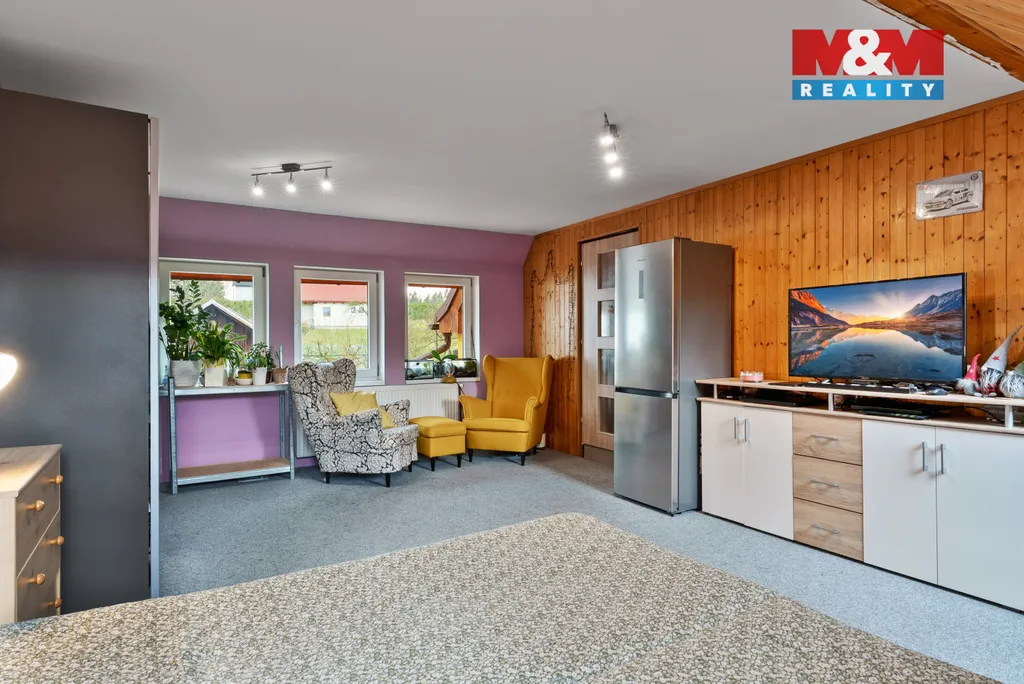 Součástí nemovitosti je také velká garáž, která poskytne dostatek místa nejen pro parkování, ale i pro dílnu či skladování. Na zahradě navíc najdete praktické dřevníky, ideální pro uskladnění dřeva i zahradní techniky.