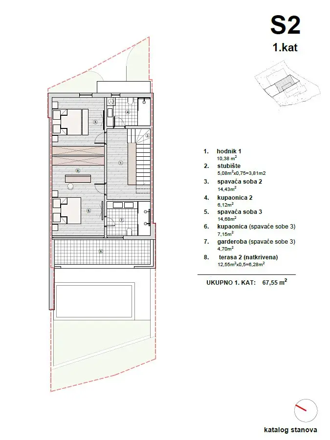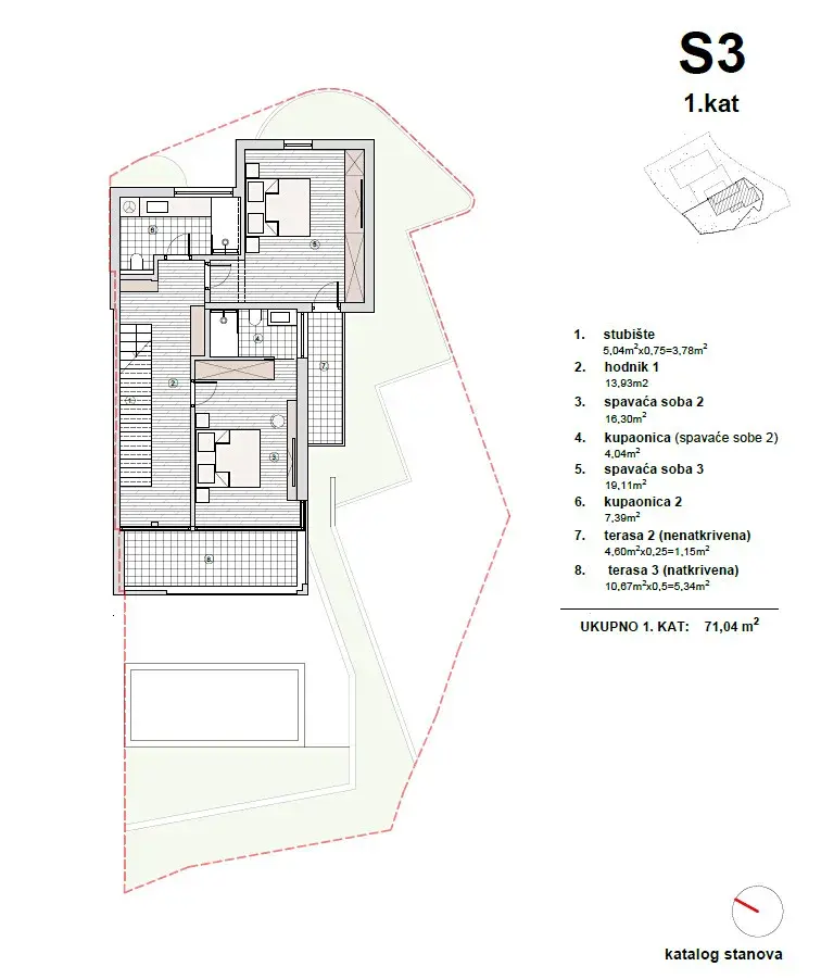 V prvním patře o velikosti 67,55 m² je umístěna hlavní ložnice s vlastní koupelnou, šatnou a krytou terasou o velikosti 12,55 m², dále další ložnice a samostatná koupelna. Vrcholem nemovitosti je střešní terasa o velikosti 21,63 m² s panoramatickým výhledem na moře a okolí, vybavená přípojkami na vodu a elektřinu, což umožňuje vytvoření soukromé relaxační zóny například s vířivkou.