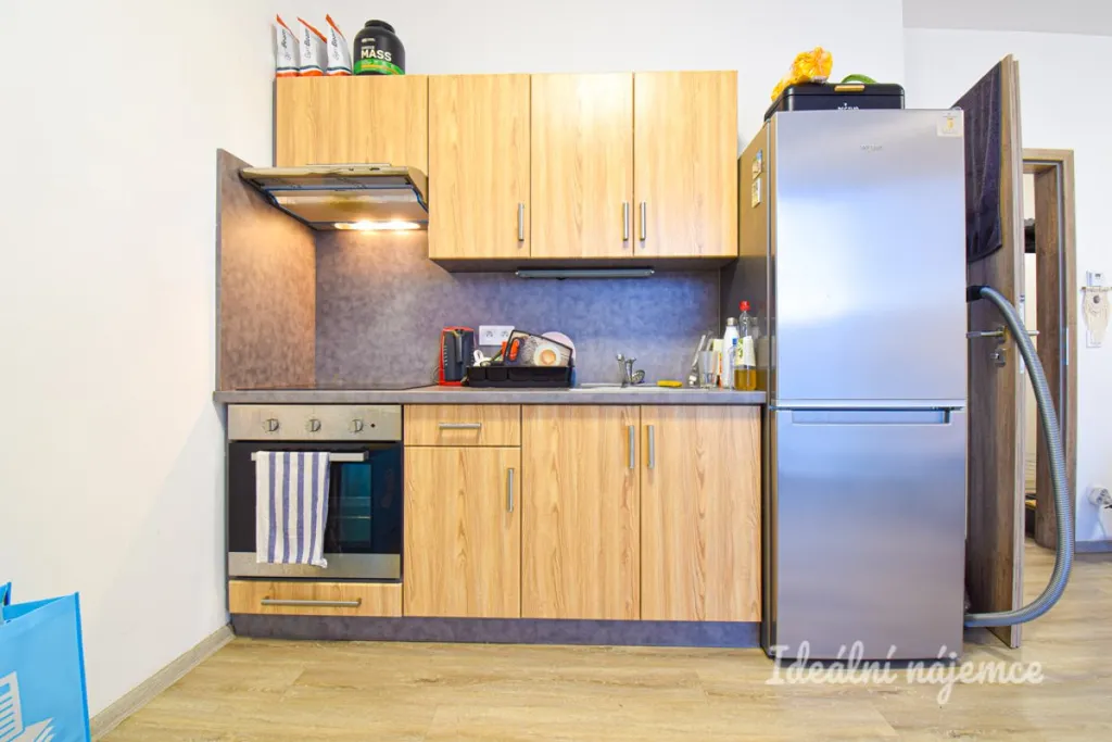 Byt bude oproti fotografiím nevybavený, zůstává pouze zařízená kuchyně a koupelna se sanitou. V koupelně je k dispozici pračka. V kuchyni trouba, varná deska s digestoří a lednice. V celém bytě je podlahové vytápění.