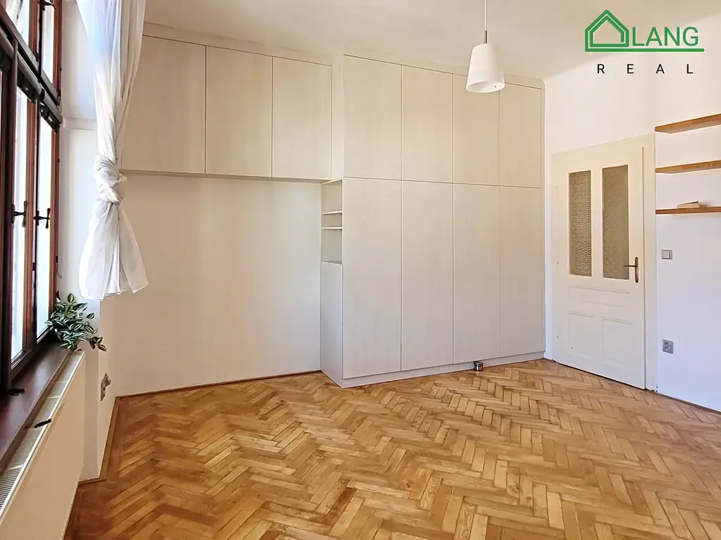 Výhled do zeleného klidného vnitrobloku má i pokoj s kuchyňským koutem. Pokoj je díky vysokým stropům vzdušný, prostorný, je zařízen obývací stěnou s úložnými prostory a nástěnným držákem na televizor, konferenčním stolkem a kvalitními policemi s masivu. Kuchyňský kout na míru má všechny potřebné spotřebiče, velkou pracovní plochu s dřevěným povrchem, je vybaven velkým množstvím skříněk a šuplíků a kvalitním osvětlením nad linkou.