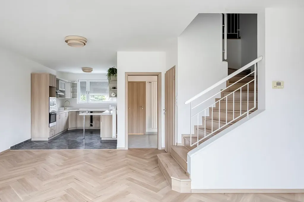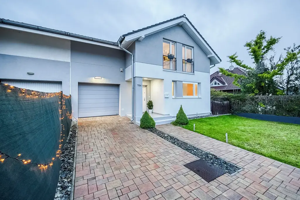 Dům nabízí komfortní dispozici 5+kk s dostatkem prostoru pro celou rodinu – prostorný obývací pokoj s přímým vstupem na zahradu, kuchyň s jídelním koutem, čtyři ložnice, koupelna, dvě toalety, technické zázemí a garáž.