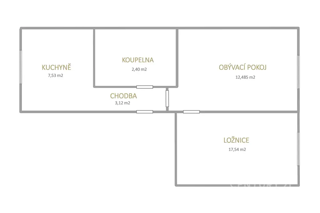 Dispozice 2+1 (43,2 m²): Praktické uspořádání nabízí samostatnou ložnici (17,5 m²), obývací pokoj (12,5 m²) a samostatnou kuchyň (7,5 m²) s jídelním koutem. Přesné výměry dle přiloženého půdorysu.