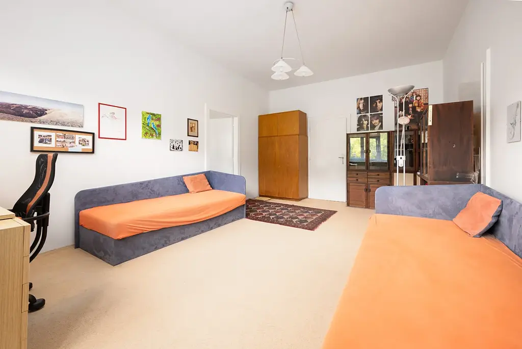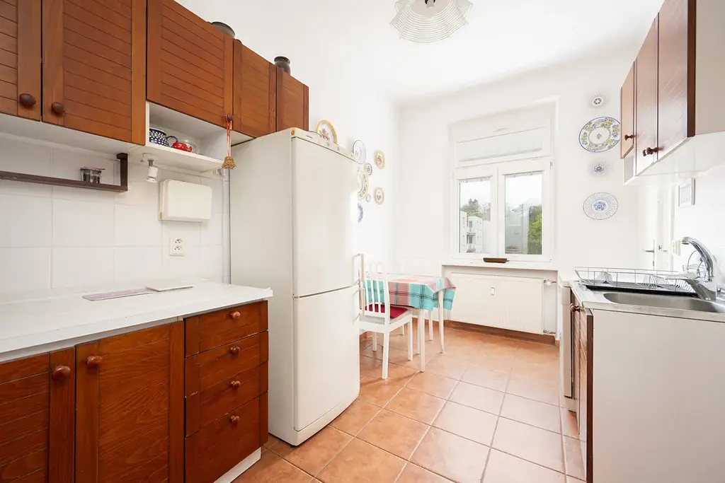 V bytě jsou zachovalé parketové podlahy.