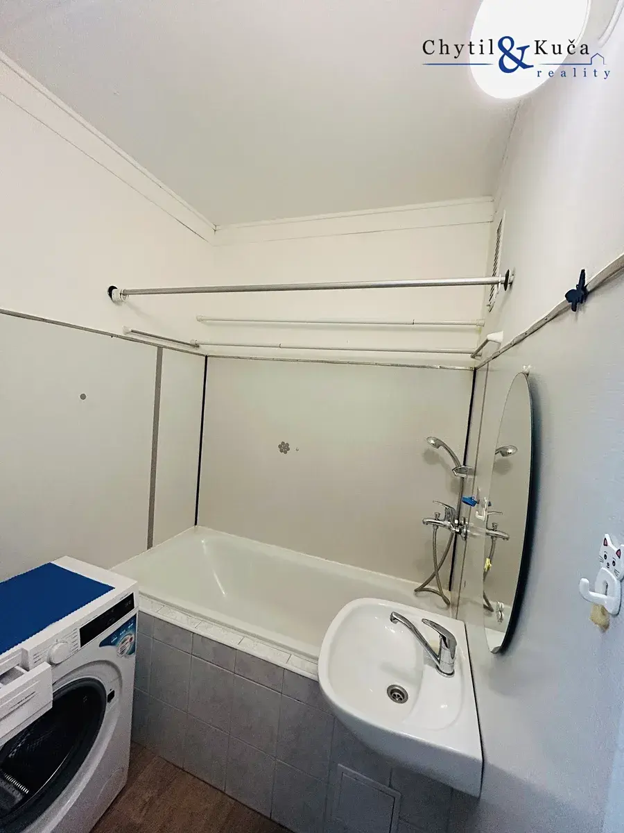 Byt je dispozičně řešený jako 1+1 (chodba, koupelna, wc, jeden pokoj, kuchyně). V bytě je sice umakartové jádro, ale byt je čistý a velmi udržovaný.