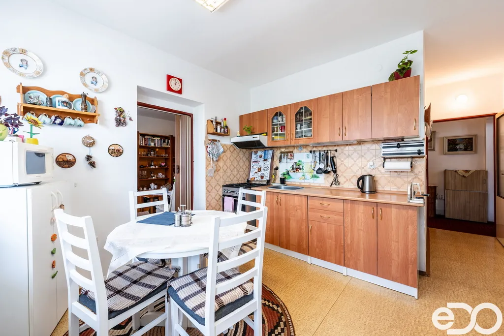 Byt je v původním, ale velmi pěkném a udržovaném stavu, což umožňuje okamžité bydlení nebo rekonstrukci dle vlastních představ. Nechybí ani praktické úložné prostory – komora přímo v bytě, další komora na patře a sklep o velikosti 2 m².