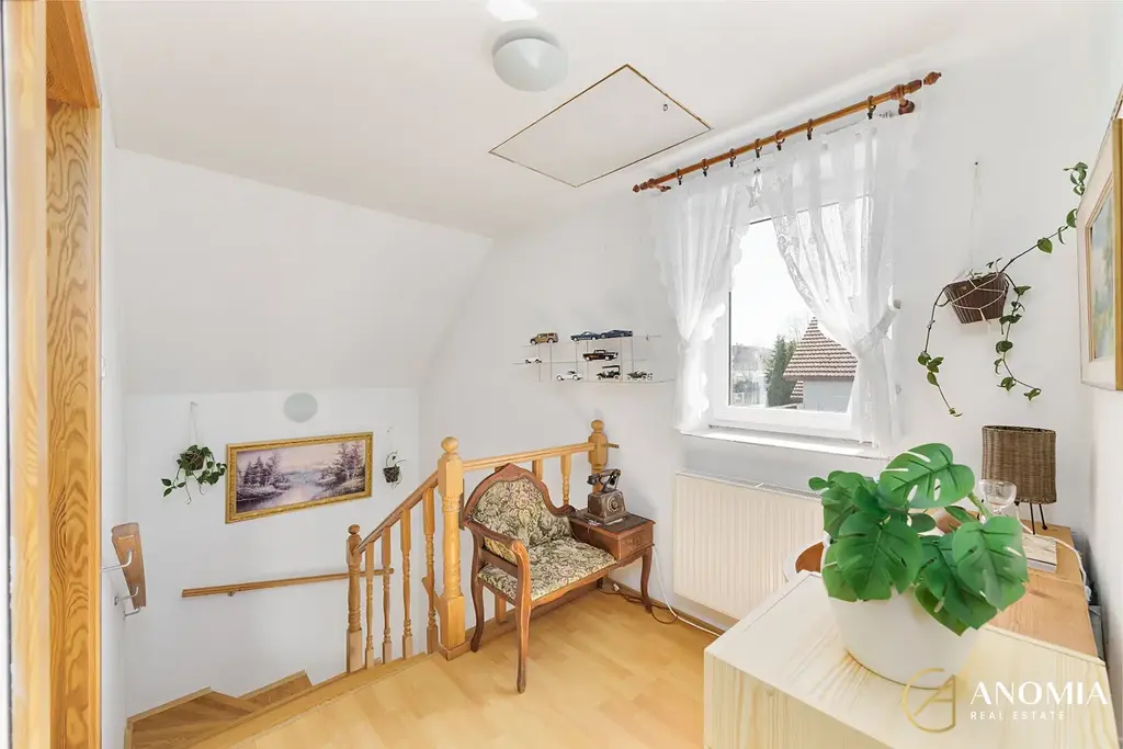 V patře se nacházejí dva samostatné pokoje, koupelna s WC a chodba se schodištěm. Pokoje mají výměry 18,11 m² a 17,60 m², takže oba nabízejí komfortní prostor například pro ložnici, dětský pokoj nebo pracovnu.