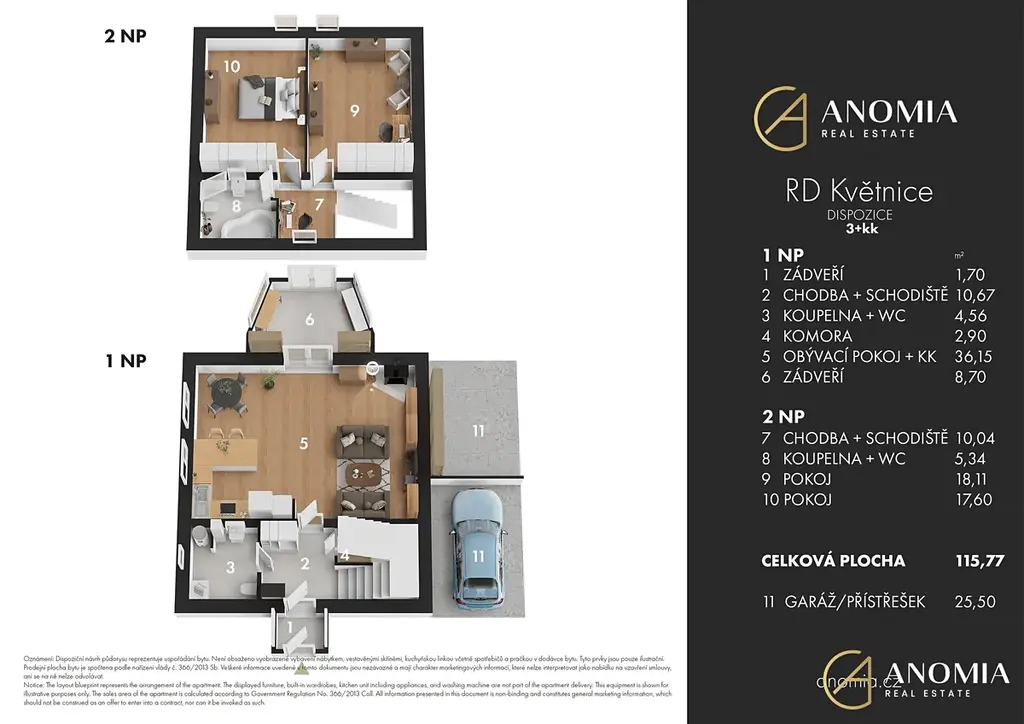 Dům má dle půdorysu celkovou podlahovou plochu 115,77 m² a stojí na rovinatém pozemku o velikosti 460 m². Součástí nemovitosti je také kryté parkovací stání / přístřešek o ploše 25,50 m².