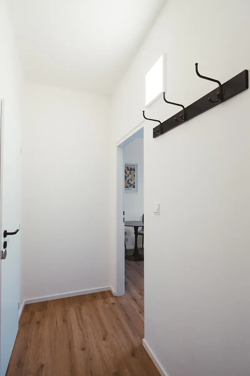 Byt samotný má dispozici 1+kk a skládá se z předsíně, koupelny se sprchovým koutem, umyvadlem, WC a pračkou a hlavní obytné místnosti. V hlavní místnosti naleznete menší kuchyňskou linku (malá lednice, mikrovlnka s grilem, varná deska, digestoř), jídelní stůl a 2 židle, TV skříńka, postel 140x200cm, velkou šatní skříň, malou sedačku se stolečky. V oknech jsou záclony, zatemňovací záclony na míru a venkovní rolety.