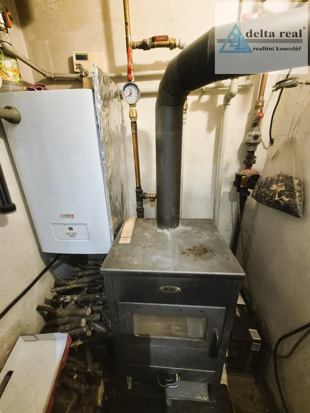 Topení je ústřední s kotlem na elektřinu a krbová kamna s výměníkem, ohřev vody je elektrickým bojlerem.