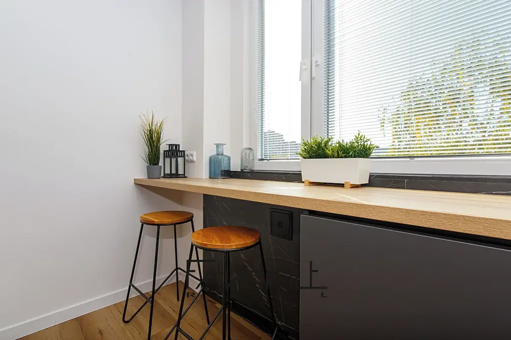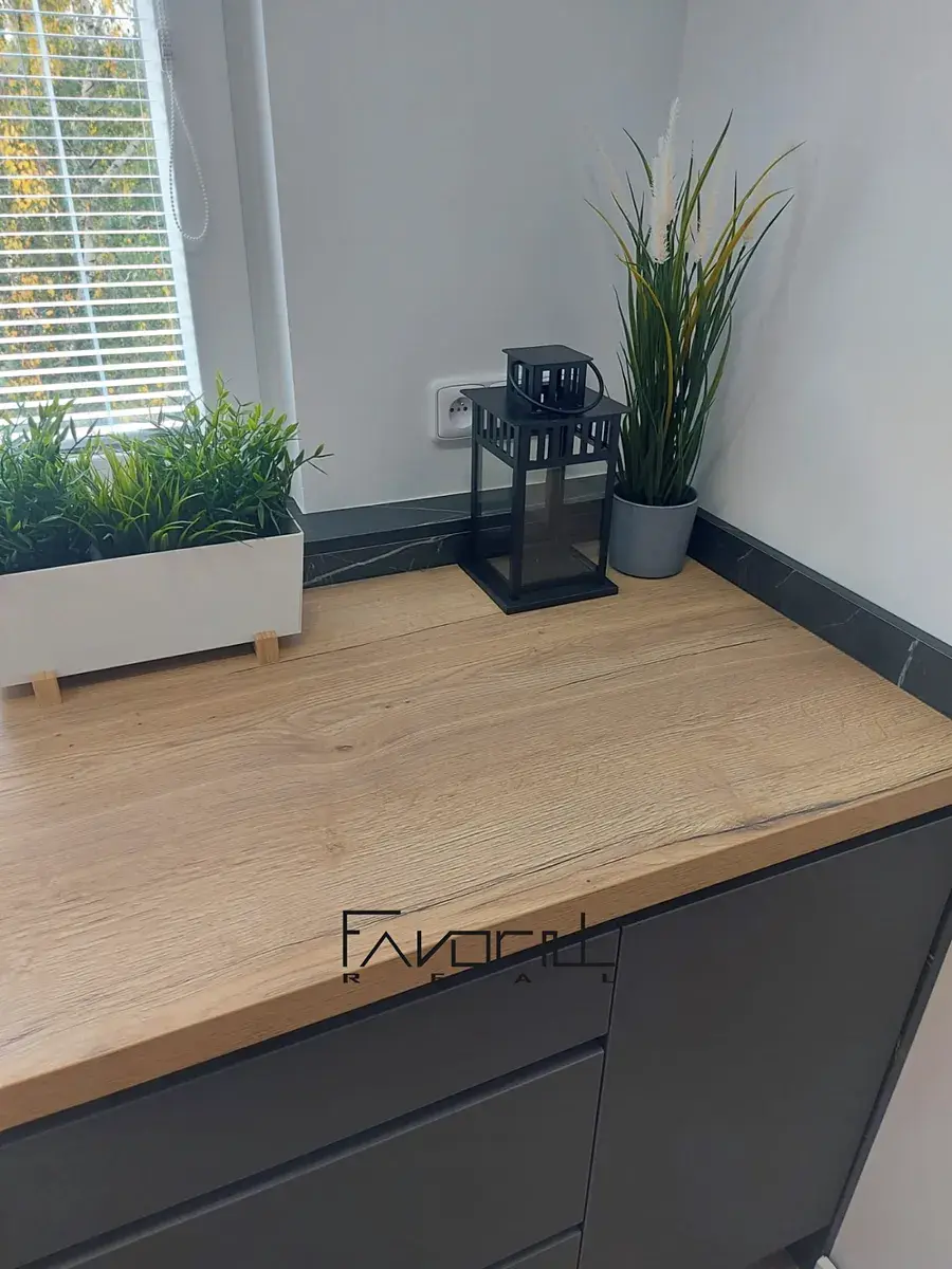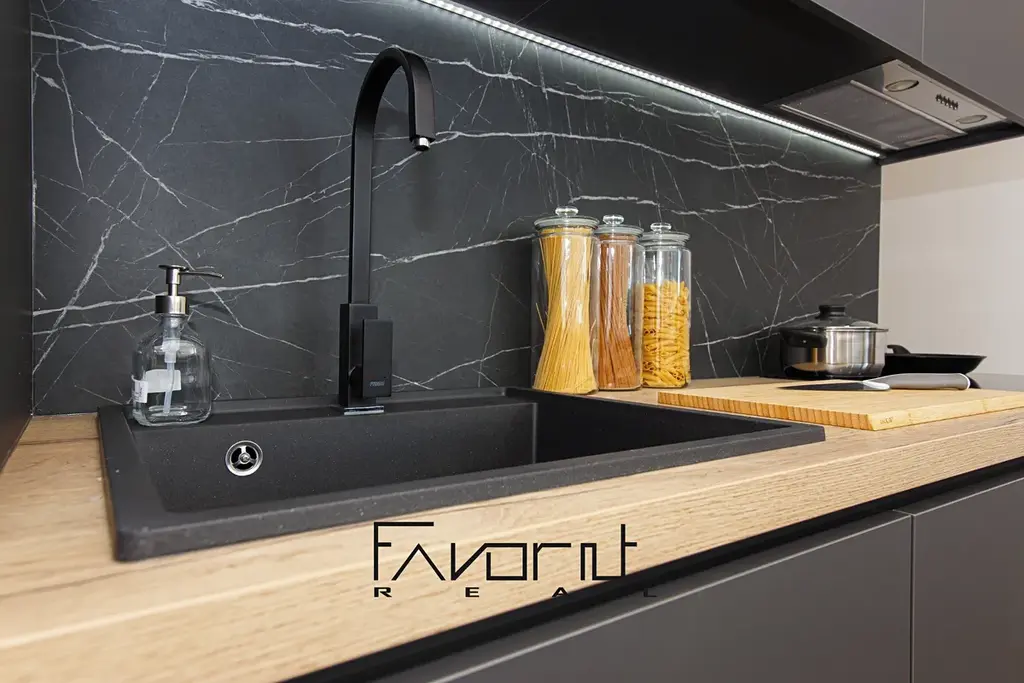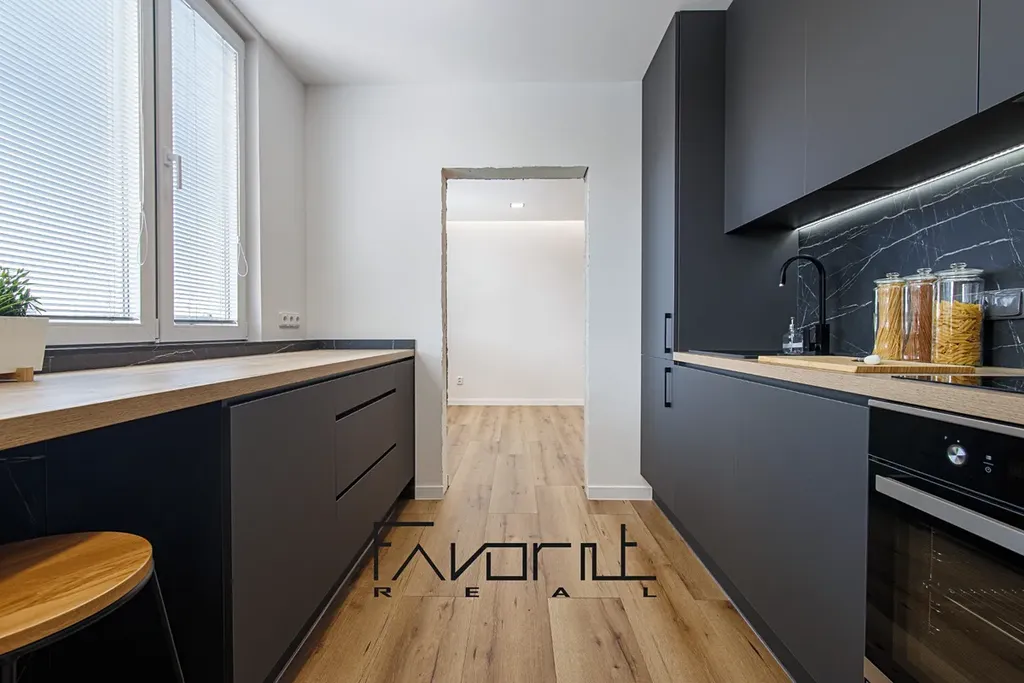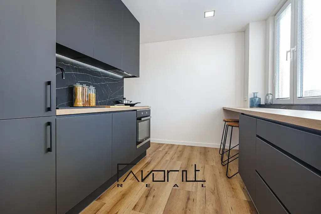 V kuchyni je nová kuchyňská linka na míru od stolaře včetně vestavěných spotřebičů (lednice, pračka, digestoř, myčka, elektrická varná deska, elektrická trouba). Pod celou plochou vrchních skříněk a spodních skříněk je podsvícení (LED dioda). Pro snadnější dovírání skříněk a šuplíků slouží tlumení dojezdů. Zástěna za KL je protažena až do stropu.