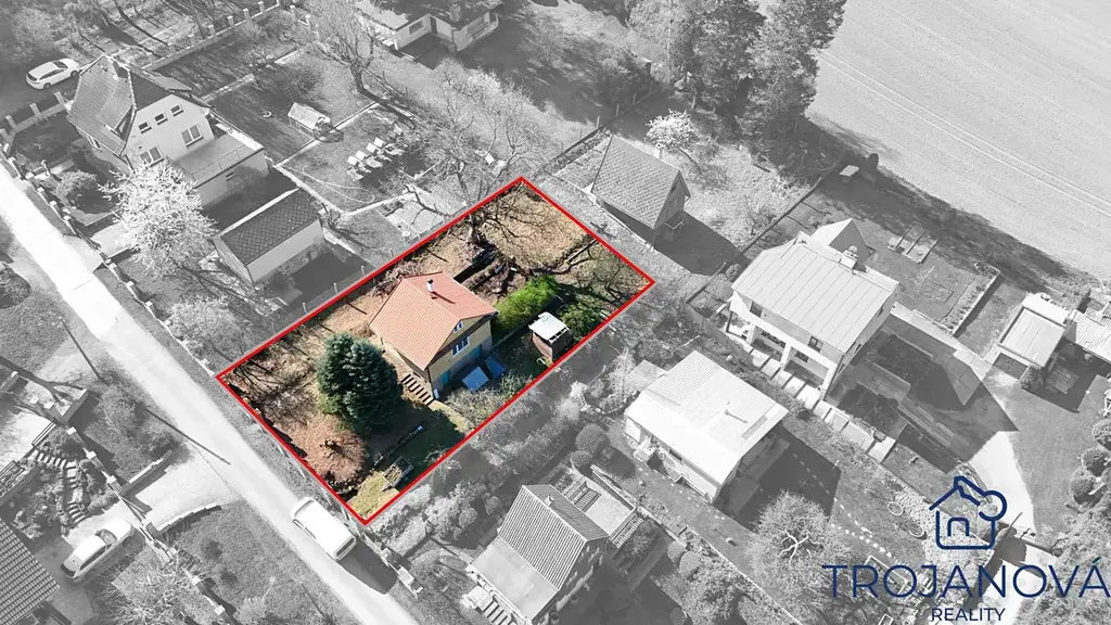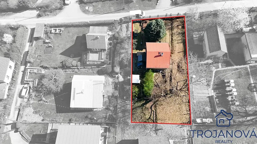 Pozemek: Jak je vidět na leteckém snímku, chata je chytře umístěna tak, aby vám zbyla prostorná a slunná zahrada (579 m2) se vzrostlými stromy, které zajišťují soukromí.