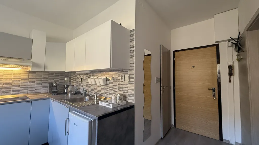 Tento byt s klasickou dispozicí 1+1, sestávající ze vstupní chodby, koupelny s WC, velké moderní kuchyně s jídelním koutem, prostorného obývacího pokoje s ložnicí a výstupem na lodžii, již na první dojem působí velmi útulně a příjemně.