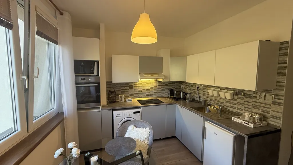 Kombinace dřevěných dveří se zárubněmi, na míru zhotovené a zařízené kuchyně se sporákem, digestoří, lednicí s mrazákem, horkovzdušnou troubou, pračkou a mikrovlnou troubou, vstupní chodby s botníkem a věšáky na kabáty, vybavenou moderní koupelnou se sprchovým koutem, WC, umyvadlem, zrcadlem a skříňkami, prostorného obývacího pokoje s ložnicí, novou manželskou postelí, TV stěnou a v neposlední řadě s vestěnou šatní skříní s velkým úložným prostorem, to vše tvoří vyvážený a harmonický celek, domov. Vše doplňují příjemná svítidla, přesně tam, kde by jste je čekali. Z celého bytu dýchá útulno, čisto a klid.