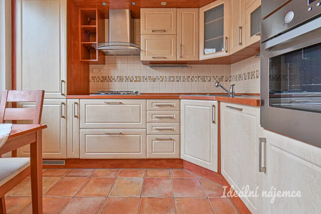 Byt se nabízí částečně vybavený. Kuchyně disponuje vestavěnými spotřebiči - lednicí, mrazákem, plynovým sporákem a digestoří, elektrickou troubou, mikrovlnnou troubou. V kuchyňské lince je umístěna také pračka a kuchyň je vybavena jídelním stolem se 2 židlemi. Pokoj je zařízený šatní skříní, komodou a psacím stolem. V koupelně je vana, umyvadlo a toaleta. Skříň a věšáková stěna nabízí úložný prostor v předsíni.