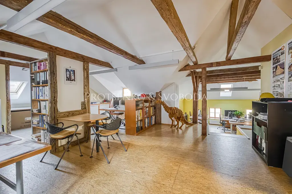 Vysoké stropy, velká okna a vzdušné prostory dnes tvoří ideální zázemí pro kanceláře, obchody i bydlení — s možností úprav podle potřeb nového majitele.