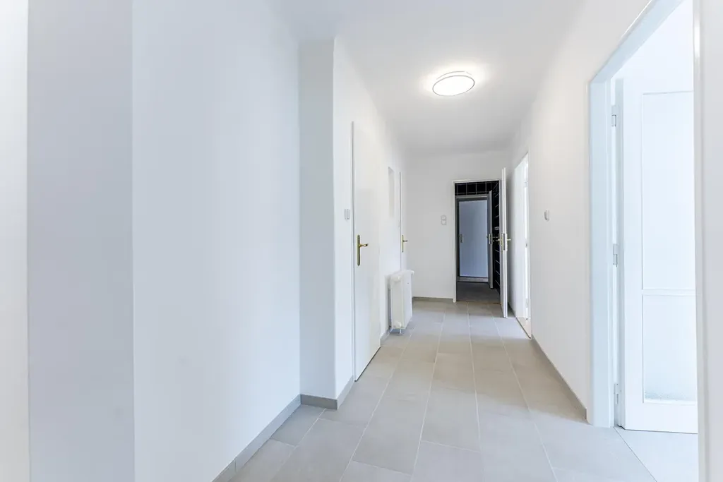 Po vstupu do bytu Vás uvítá chodba, z které se hned dostanete do nově instalované, moderně vybavené kuchyně, která disponuje kuchyňskou linkou s myčkou, plynovým sporákem a elektrickou troubou. Následují dva prostorné pokoje, které jsou umístěny vedle kuchyně a jsou propojené dveřmi, přičemž každý pokoj má i samostatný vstup z chodby. V pokojích je krásná renovovaná dřevěná podlaha, zatímco v kuchyni a na chodbě je položena elegantní dlažba. Po levé straně vstupní chodby se nachází praktická komora a samostatná toaleta. Koupelna je vybavena sprchovým koutem a je průchozí, za ní se nachází šatna s velkou vestavěnou skříní a vstupem do zadní ložnice. Tato šatna může být využita nejen jako úložný prostor, ale také do ní lze umístit malý stůl a využívat jako pracovní koutek, případně místo pro kreativní činnosti nebo relaxaci.