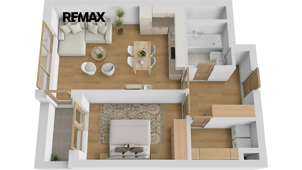 Hlavní místností je velký obývací pokoj s plně vybavenou moderní velkou kuchyní, širokým výhledem do přírody, výstupem na lodžii a stíněním dálkově ovládanou žaluzií. Druhý pokoj má taktéž výstup na lodžii a je vybaven vestavěnou skříní. Koupelna je vybavena vanou se sprchovou zástěnou. Komora má již připravený regálový systém a pračku se sušičkou. Chodba je vybavena vestavěnými skříněmi. Z obou hlavních místností je pohodlný přístup na lodžii o ploše 4 m². Příslušenstvím bytu je i sklepní prostor o ploše 3 m².