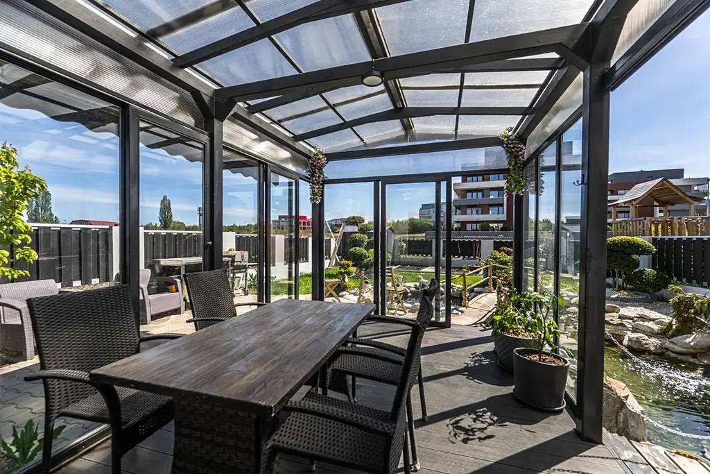 V přízemí se nachází zádveří, samostatné WC, garáž, technická místnost a prostorný obývací pokoj s kuchyňským koutem a vstupem do zimní zahrady.