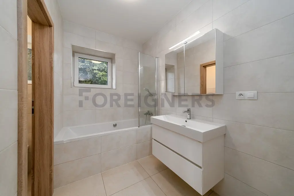 Koupelna s vanou, umyvadlem se skříňkou a zrcadlem, otopným žebříkem. Samostatnou toaletou a úklídovou místností s umyvadlem.