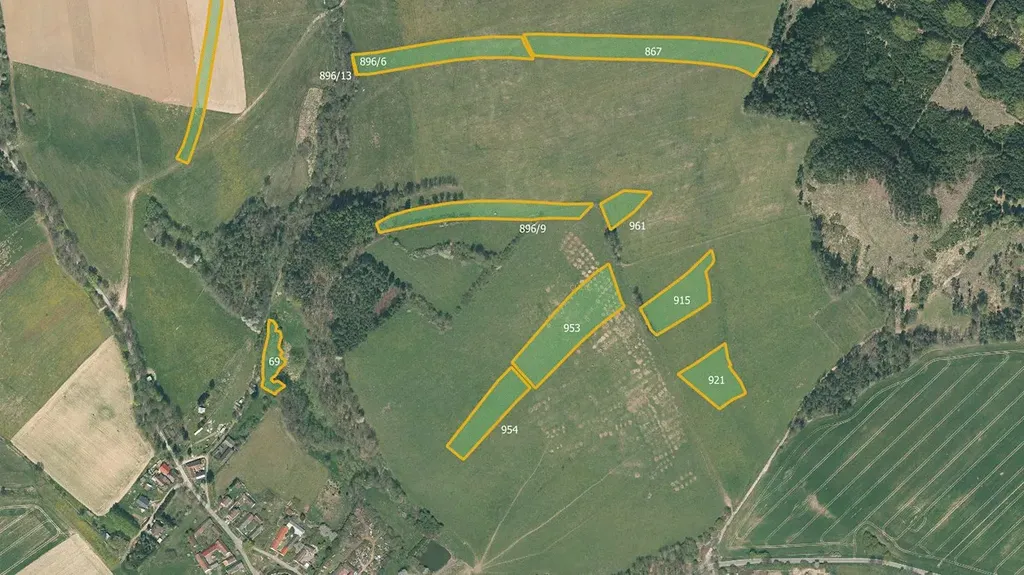 Celková výměra uvedených parcel je 116 361 m2. Vlastník na nich nabízí k prodeji svých 19 394 m2. Z toho orná půda je 11 955 m2, trvalý travní porost 1 016 m2, lesní pozemek 6 421 m2 a vodní plocha 2 m2.