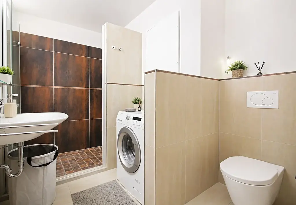 V koupelně je zděný sprchový kout, umyvadlo, pračka a toaleta.